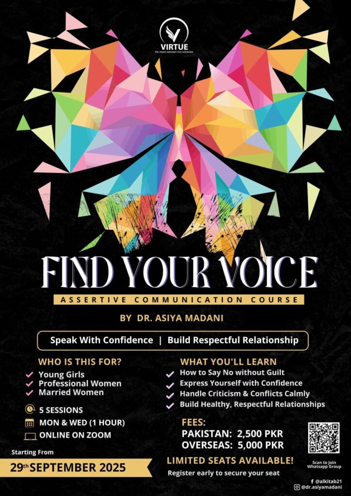 Learn to communicate with confidence, set healthy boundaries, and build respectful relationships through practical, empowering sessions designed for women.